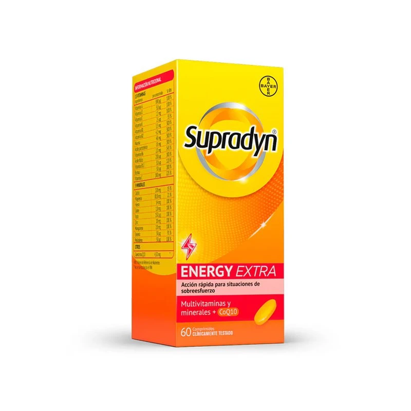 Supradyn Energy Extra es un complemento alimenticio diario completo con 13 vitaminas, 9 minerales y coenzima Q10, formulado para personas activas o deportistas que necesitan mantener su energía, resistencia física y función muscular. Ideal para quienes practican deporte con frecuencia o tienen un ritmo de vida exigente, ayuda a cubrir las necesidades energéticas del organismo sin afectar el descanso.