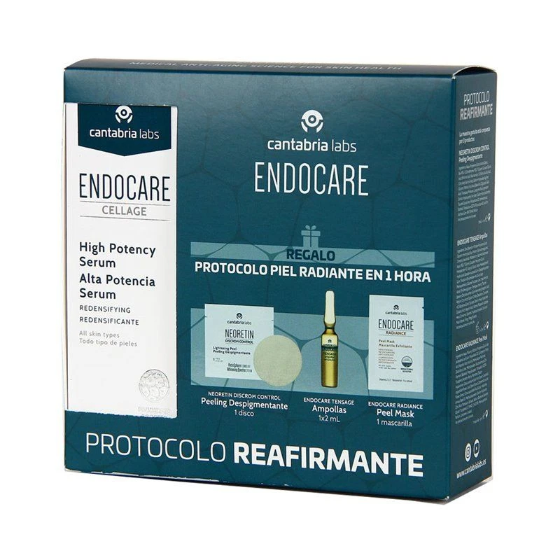 Pack Protocolo Reafirmante de Endocare, compuesto por Endocare Cellage Serum Alta Potencia, 1 disco Neoreting peeling, 1 ampolla Endocare Tensage y 1 mascarilla Endocare Radiance Peel Mask.