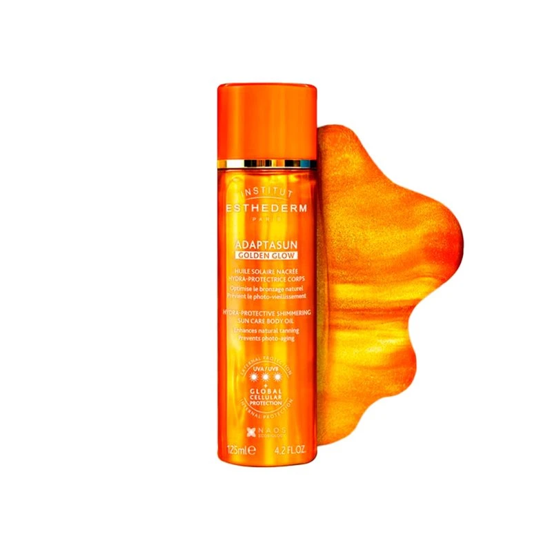 El Esthederm Adaptasun Golden Glow Aceite Solar es el primer tratamiento solar en formato aceite que combina protección efectiva con un efecto iluminador inmediato. Su fórmula avanzada, enriquecida con la tecnología ADAPTASUN, está diseñada para potenciar y prolongar el bronceado, mientras asegura una protección UVA/UVB eficaz y previene el fotoenvejecimiento.