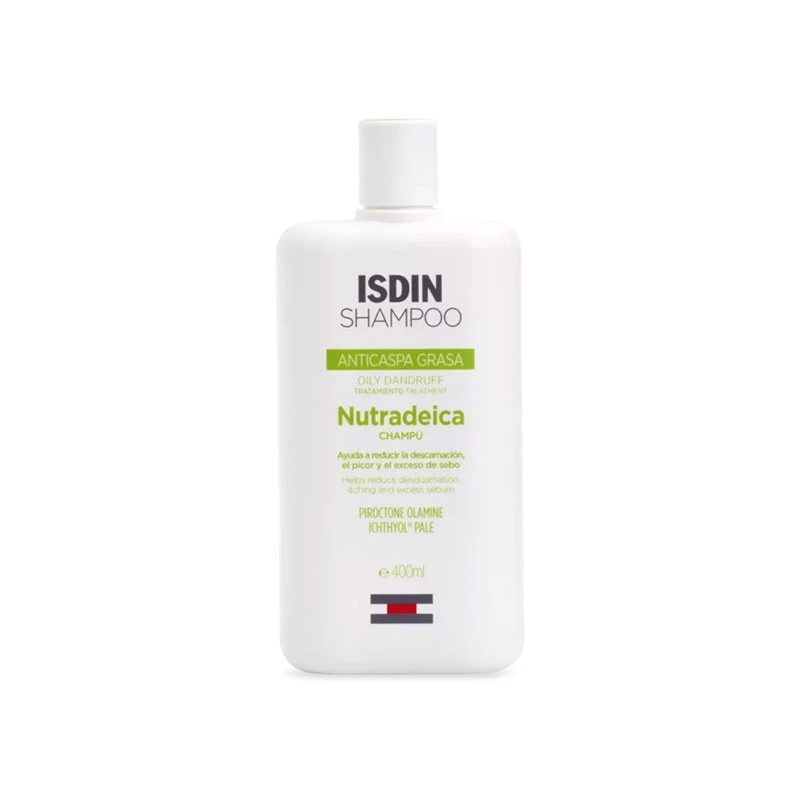 Isdin Nutradeica Champú Anticaspa Grasa 400 ml es un champú especializado en la higiene y cuidado del cuero cabelludo con caspa grasa. Su fórmula avanzada combina Ichthyol® Pale, piroctona olamina y laureth-9, que trabajan juntos para reducir el exceso de sebo, eliminar la caspa y aliviar el picor desde las primeras aplicaciones. Dermatológicamente probado, está diseñado para uso en adultos y adolescentes mayores de 12 años.