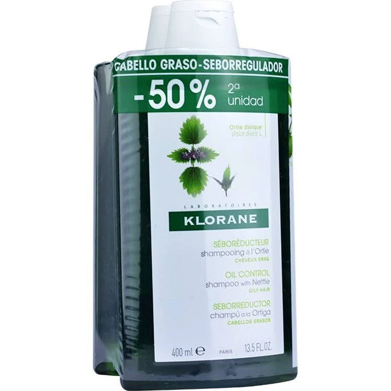 Klorane Champu a la Ortiga 400 ml + 400 ml 50% 2o Unidad Gracias a su base lavante equilibrante enriquecida en extracto de Ortiga, este champú elimina y regula suavemente el exceso de sebo. Una vez purificado, el cuero cabelludo queda limpio y el cabello ligero y suelto durante más tiempo.