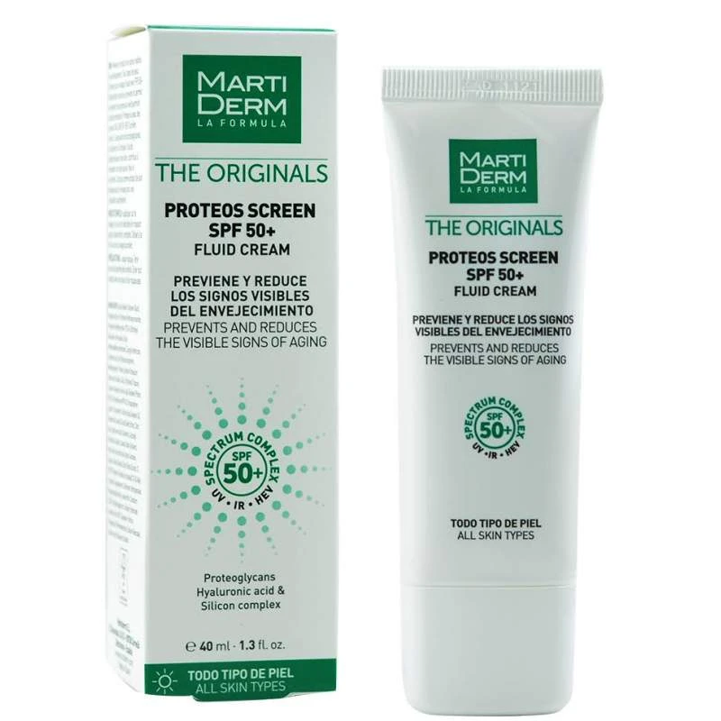 Martiderm Proteos Screen Fluid Cream SPF50+ 40ml Crema que reduce y previene la manifestación de manchas de pigmentación, actuando tambin sobre las manchas provocadas por el paso de los años. Adems, su factor de proteccin solar SPF50+, ofrece una amplia protección frente a la radiación de los rayos UVA y UVB. Un efecto despigmentante intensivo para todo tipo de pieles. Acción anti-edad. Aplicar 2 o 3 veces al día sobre la zona a tratar.