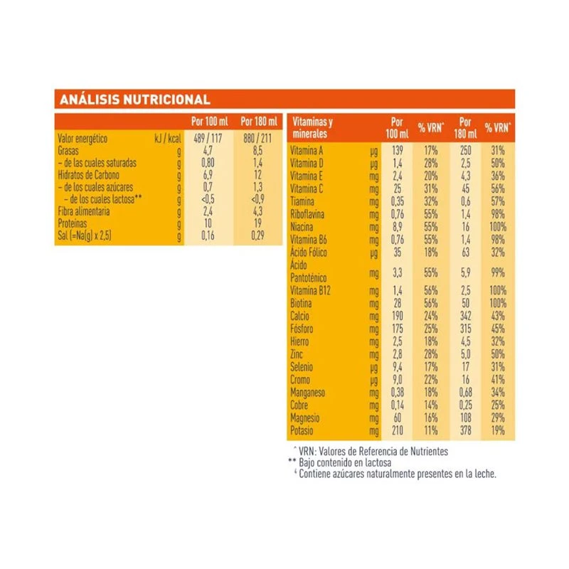 - Vitaminas y minerales esenciales: Enriquecido con 22 vitaminas y minerales, incluyendo calcio y vitamina D para mantener los huesos en condiciones normales, y vitaminas B2 y B6 para reducir la fatiga.