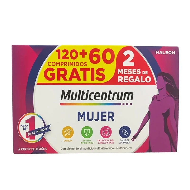 Multicentrum Mujer 180 Comprimidos es un suplemento multivitamínico diseñado específicamente para satisfacer las necesidades nutricionales de las mujeres. Su fórmula completa y equilibrada proporciona una amplia gama de vitaminas y minerales esenciales para mantener la salud y el bienestar general. Entre sus ingredientes clave se encuentran el ácido fólico, calcio, vitamina D y hierro, que favorecen la salud ósea, cardiovascular y la energía. Esta presentación de 120 comprimidos más 60 de regalo asegura un suministro prolongado, ideal para mantener la vitalidad y el bienestar femenino.