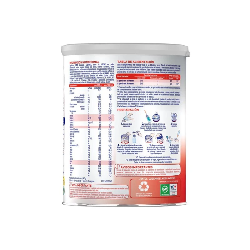 Enriquecida con vitaminas C y D que contribuyen a la función normal del sistema inmunitario, así como Hierro y Zinc que son esenciales para el crecimiento y desarrollo saludable. También contiene DHA, que es crucial para el desarrollo visual normal hasta los 12 meses de edad. Esta fórmula no contiene aceite de palma y está diseñada para adaptarse a las necesidades nutricionales específicas de los bebés en crecimiento.