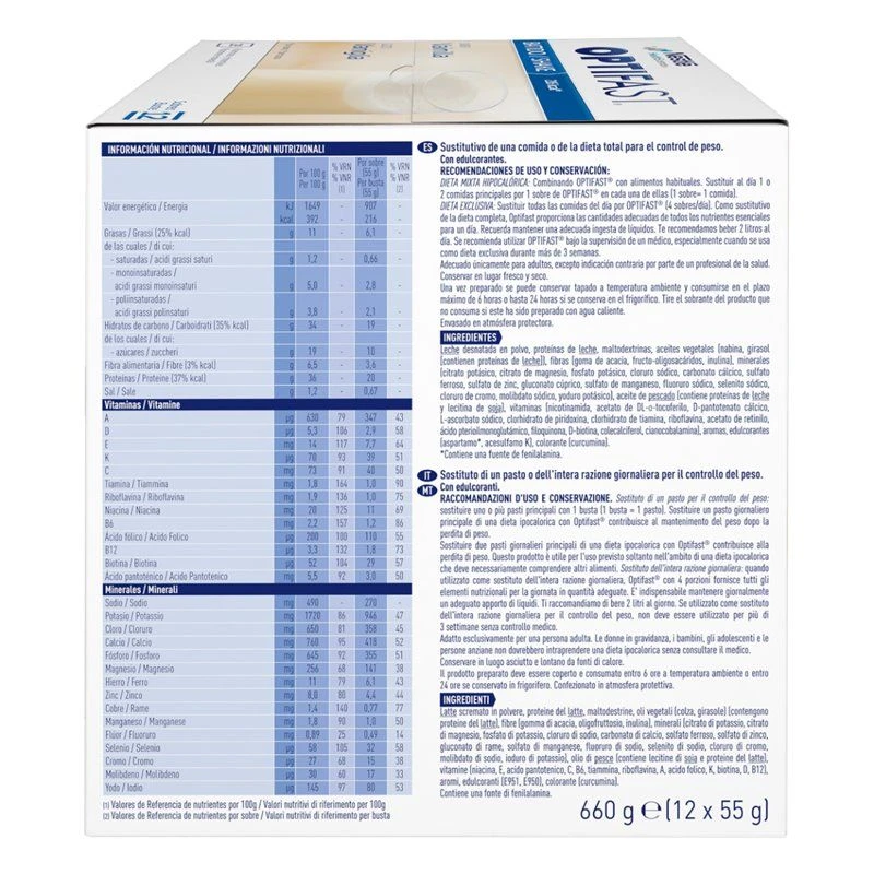 - DIETA EXCLUSIVA: Sustituir todas las comidas del día por OPTIFAST® (4 sobres/día). Como sustitutivo de la dieta completa, Optifast proporciona las cantidades adecuadas de todos los nutrientes esenciales para un día. Recuerda mantener una adecuada ingesta de líquidos.