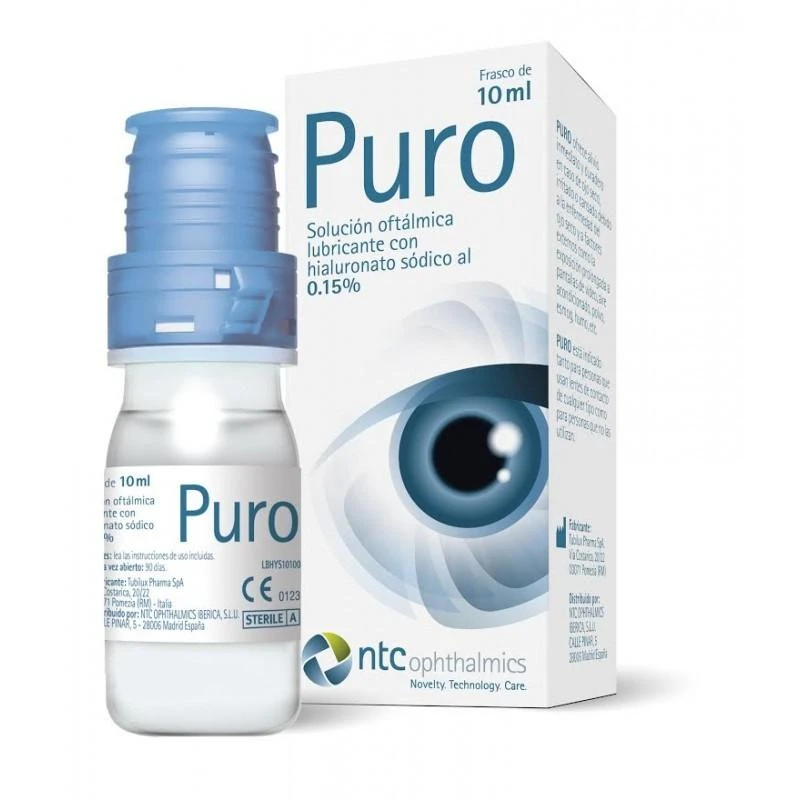 Puro Solucion Oftalmica 10Ml es una solución oftálmica estéril e hipotónica que contiene hialuronato sódico al 0,15%, sin conservantes ni fosfatos. Este producto, obtenido por fermentación y no de origen animal, mantiene y restablece las condiciones fisiológicas de la superficie ocular, protegiéndola y proporcionando comodidad de larga duración. Ideal para el tratamiento del ojo seco, irritado o cansado, esta solución es adecuada para usuarios de lentes de contacto de cualquier tipo. Alivia efectivamente las molestias causadas por factores externos como pantallas de vídeo, aire acondicionado y contaminación. Su envase debe conservarse a una temperatura inferior a 30°C y usarse dentro de los 90 días posteriores a su apertura.