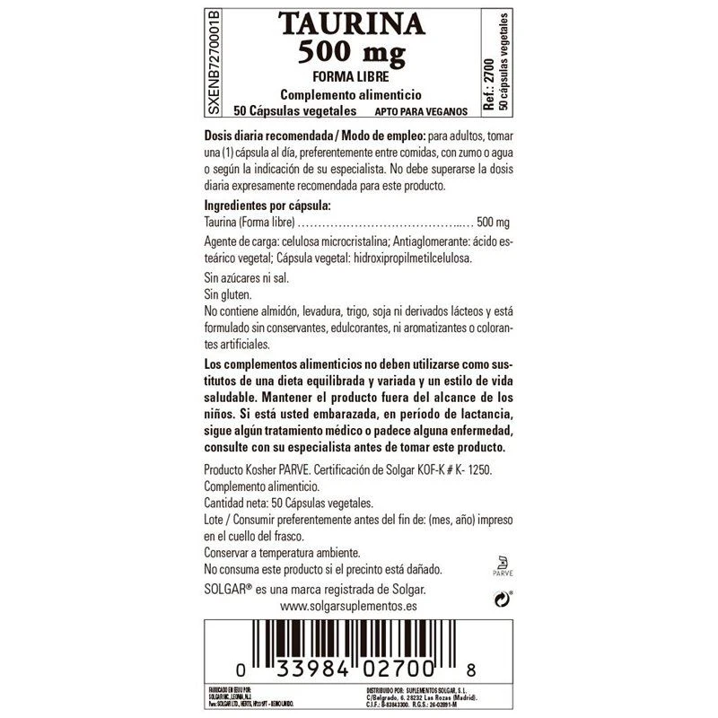Solgar® Taurina Cápsulas vegetales de 500 mg contienen taurina, un compuesto que contiene azufre y uno de los aminoácidos más abundantes en el cuerpo humano.